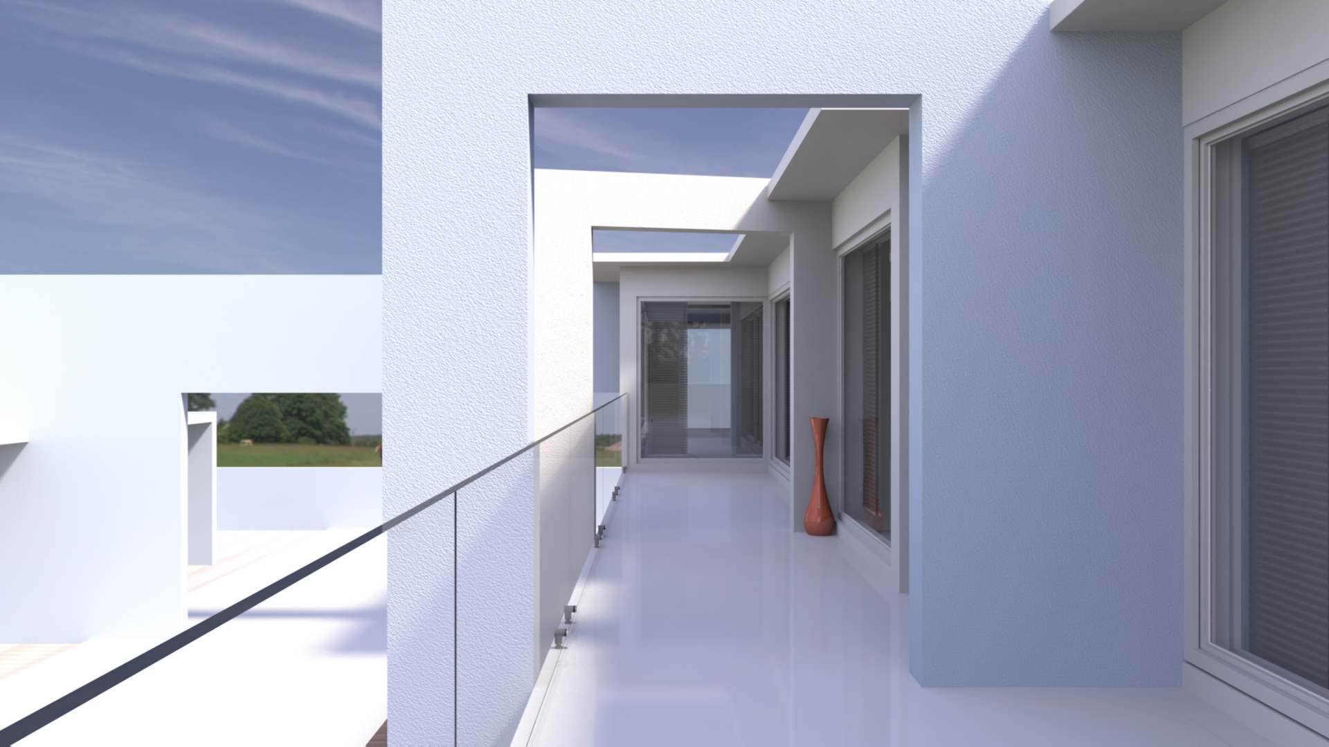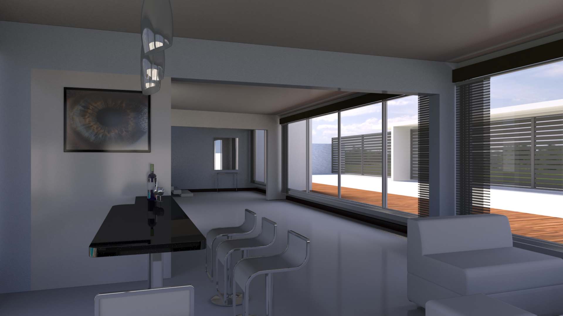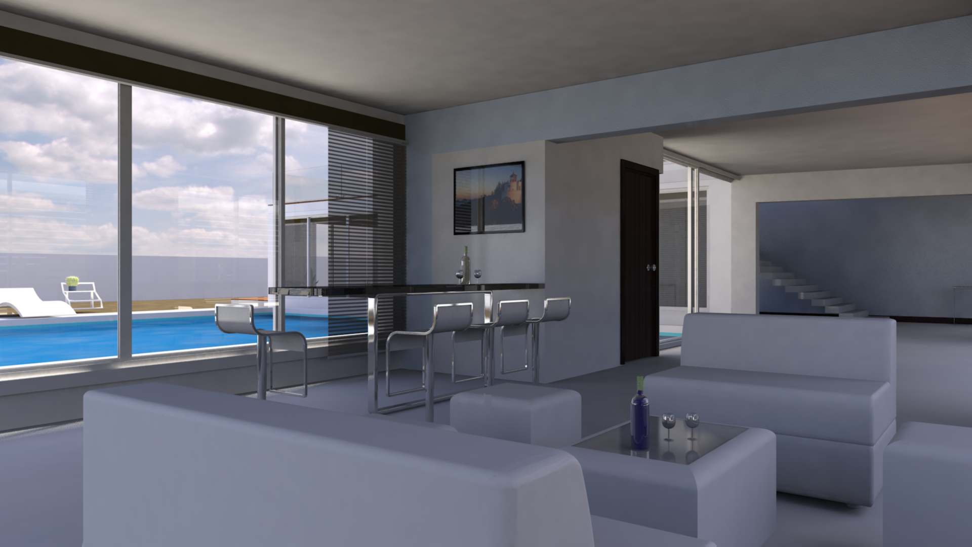 Diseño y producción de render para mostrar como ejemplo la iluminación natural que se obtiene a partir de colocar una unidad de doble acristalamiento compuesta por un vidrio Low-e Súper neutral 68 sujeto con una canceleria robusta con acabado color blanco. INTERIORES