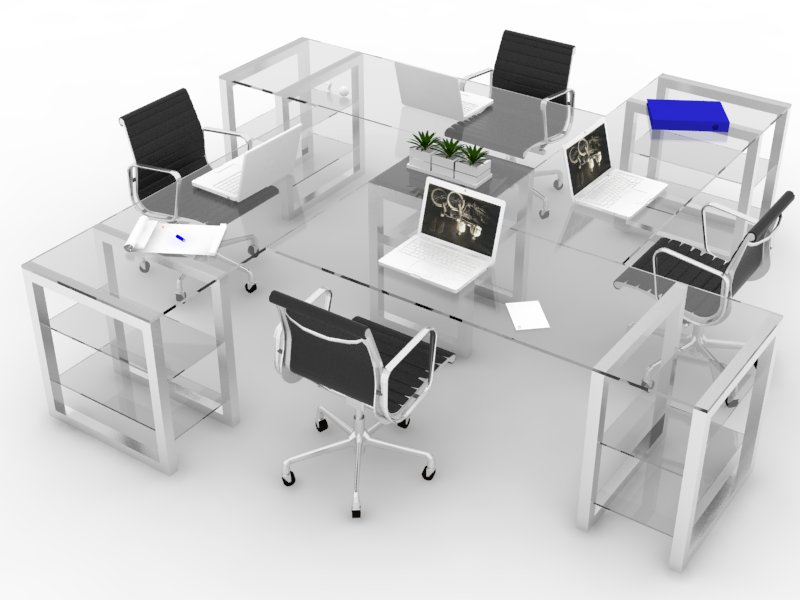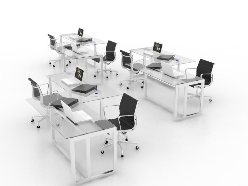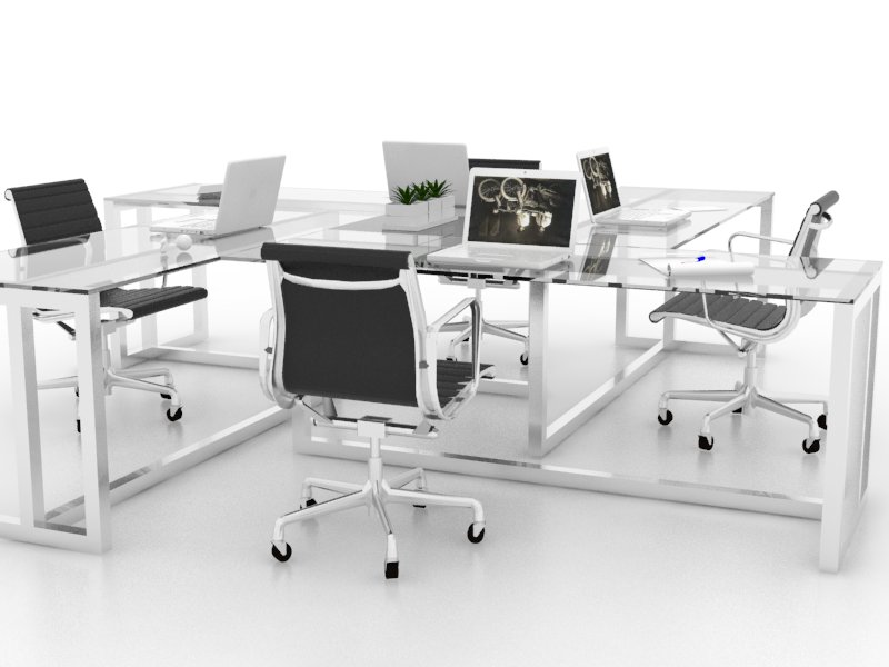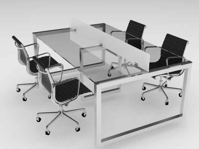 Su estructura mantiene similitud y conserva su forma modular e independencia total. Su estructura se complementa con la cubierta de vidrio templado de 9mm extra claro.ESCRITORIO COMPARTIDO PARA 4 Y 6 PERSONAS