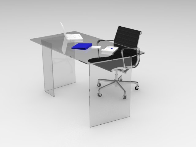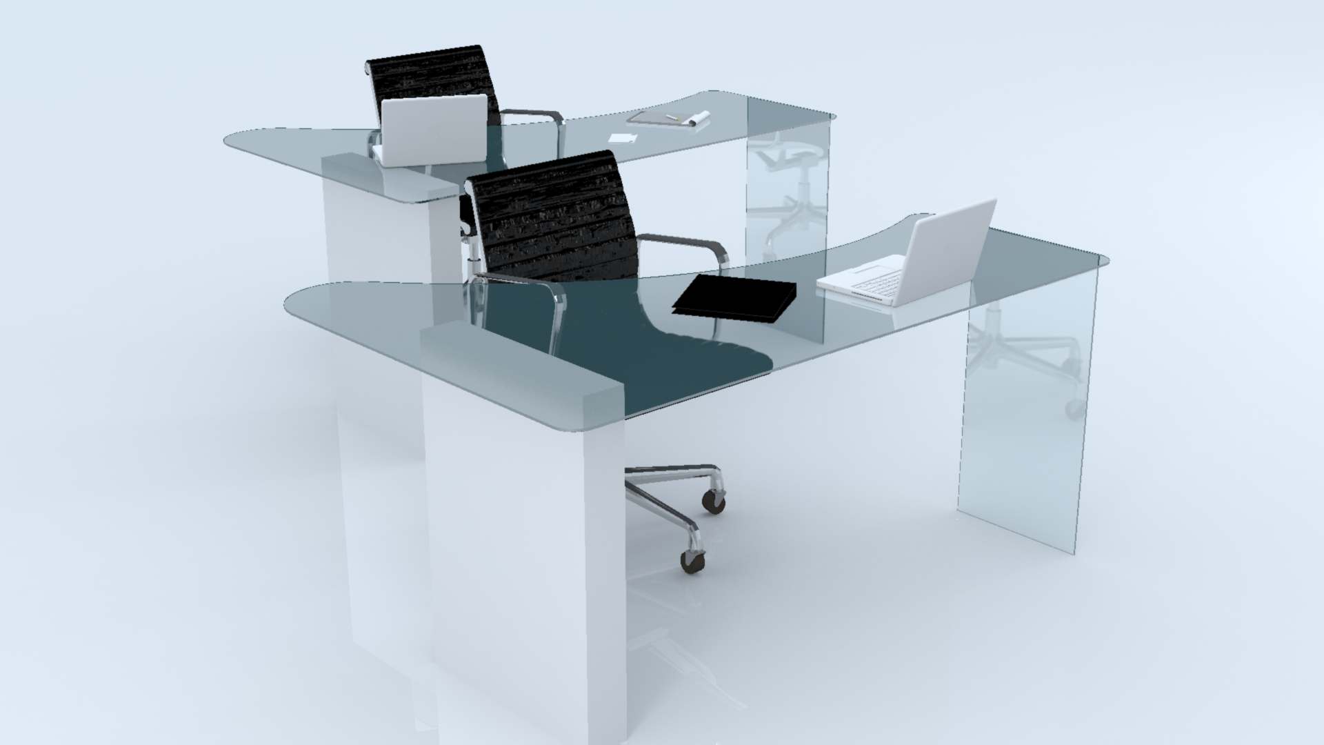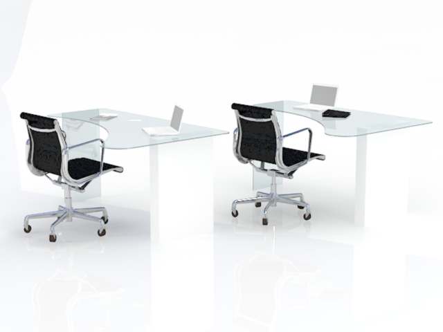 Escritorio individual con cubierta ergonómica, fabricado con vidrio claro templado de 9mm y herrajes de acero inoxidable tipo "pipa", complementado con un elemento auxiliar.